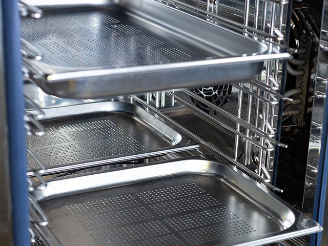 Dużą zaletą pieca konwekcyjno-parowego GOURMET jest system wkładania podłużnej blachy, który gwarantuje najlepszą równomierność gotowania oraz możliwość stosowania blach o różnej wielkości GN1/1 GN2/3 lub GN1/2 na tej samej półce; ta elastyczność gwarantuje oszczędności w zarządzaniu codziennymi czynnościami. Drugą zaletą wkładania wzdłużnego jest kompaktowość: mały rozmiar instrumentu znacznie ułatwia załadunek i rozładunek . Ponadto w tym systemie nasi inżynierowie zaprojektowali drzwi o zmniejszonych wymiarach , które dzięki krótkiemu promieniowi pozwalają na mniejsze straty ciepła, a tym samym oszczędność energii podczas codziennej pracy.